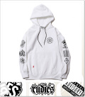 | 商品説明 | 12オンス裏起毛のコットンを使用したプルオーバーパーカ。フロント・バック・両袖にプリントが施され、オリジナルのスピンドルが付属。ブラック・ホワイトの2色展開。 |