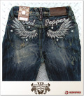 REDPEPPER人気NO.1キッズモデル・天使の羽「BB7026」品番!フロント右ポケットに羽刺繍が施され、バックお尻部分にロゴと天使の羽のラメ入り刺繍が施されています!形も人気のブーツカットタイプで超オススメです♪♪キッズジーンズはウエストのサイド部分がゴム仕様になってて子供に優しい作りです♪♪