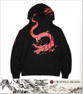 | 商品説明 | 素材はコットン100%!保温性に優れた厚手の生地を使用!前身から袖へ、後身からフードへまたがって飛翔する龍を描いたクロップドヘッズらしいジップパーカ!赤箔プリントの翔龍が非常にインパクトのある一着! |