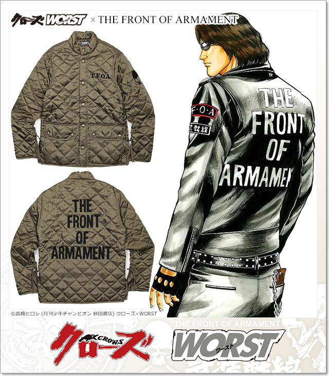 | 商品説明 | 総刺繍キルティングジャケット武田好誠モデル見参!素材は表地ナイロン100% ツイル、中綿はアクリル100%!月刊少年チャンピオン1月号掲載商品、クローズ&WORSTの新作キルティングジャケット!バックには「THE FRONT OF ARMAMENT」とチェーンステッチの刺繍!脇裾・袖裾はジッパーで開閉可能と機能性にもすぐれた動きやすいデザイン! |