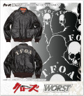 | 商品説明 | 20着限定生産!上質なカウレザーを使用した本格的なA2ジャケット!バックにT.F.O.A刺繍、左肩には武装ドクロがプリント!裏地はヴィンテージ仕様のダークオレンジ、比翼裏にはエアフォースのプリントが入る本格仕様!クローズ&WORST好きには堪らないコレクション性の高い一着! |