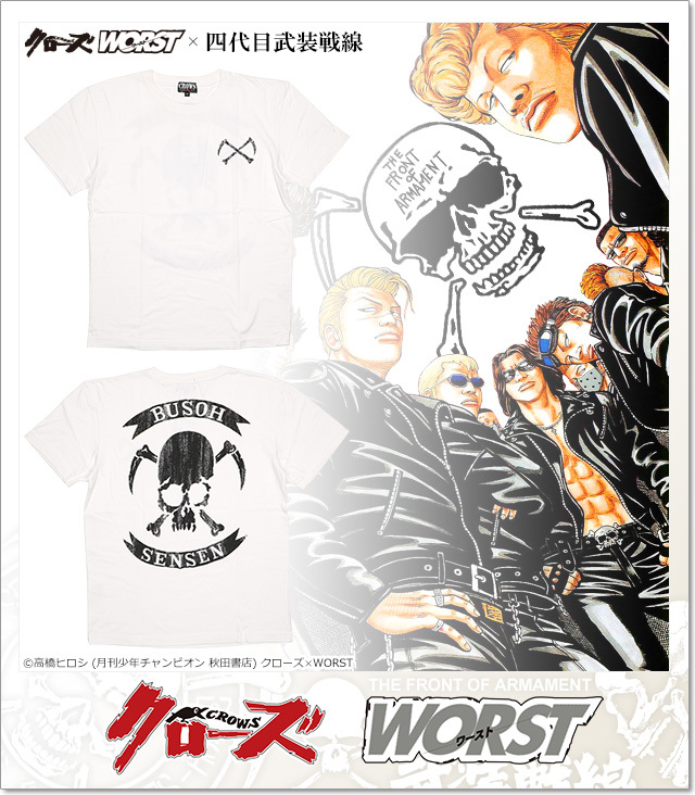 | 商品説明 | 月刊少年チャンピオン7月号掲載!素材はコットン100%!肌触りの良く柔らかいクローズオリジナルボディーを使用!四代目武装戦線の鎌髑髏を背中に大きく抜染プリントした迫力あるTシャツ!髑髏を囲む上下のBUSOH SENSENロゴは刺繍になっています! |